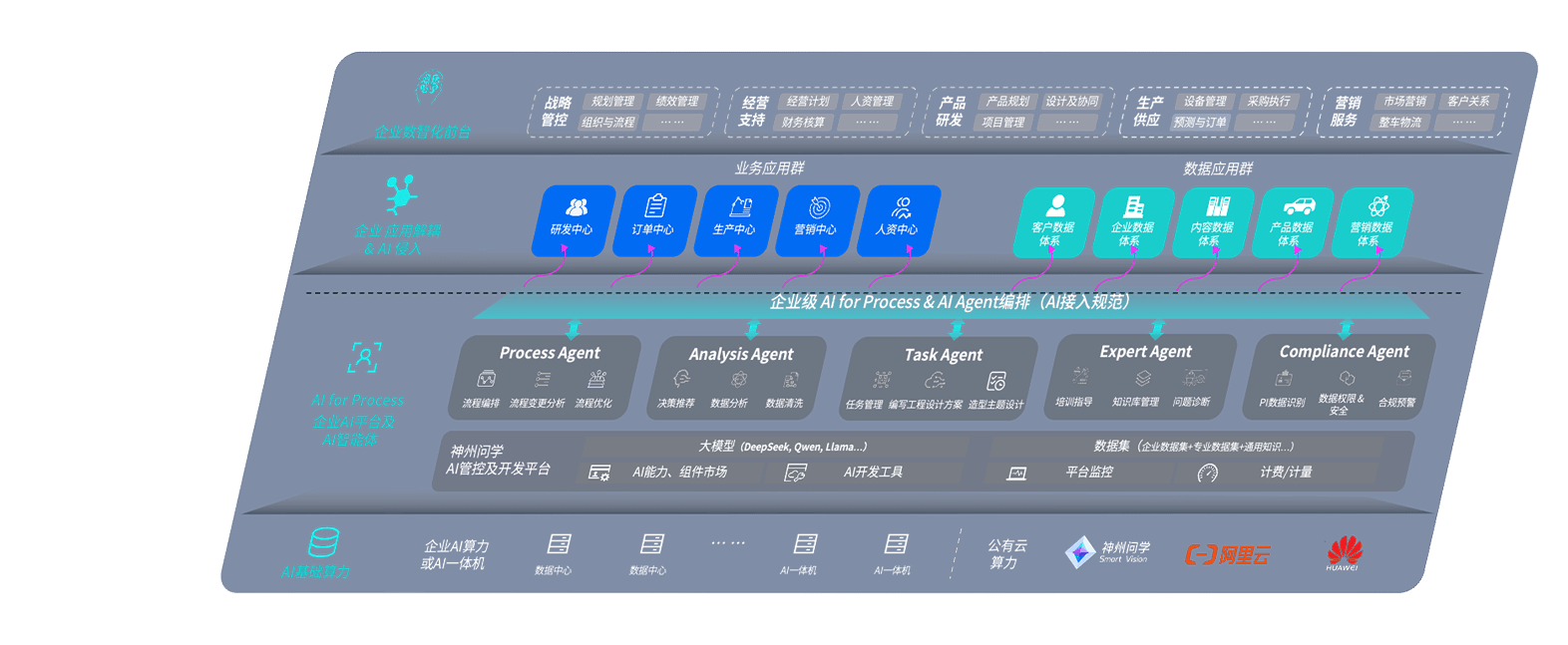 端到端的一站式AI工作空间深度融合了从企业战略规划到日常经营的全流程业务板块,,定向解决车企内部领域多、、部门多、、、、链条长、、、场景碎片化等难题,,支持车企快速构建以AI为核心的生产力写作体系,,,实现任务执行与AI能力的无缝集成与交互