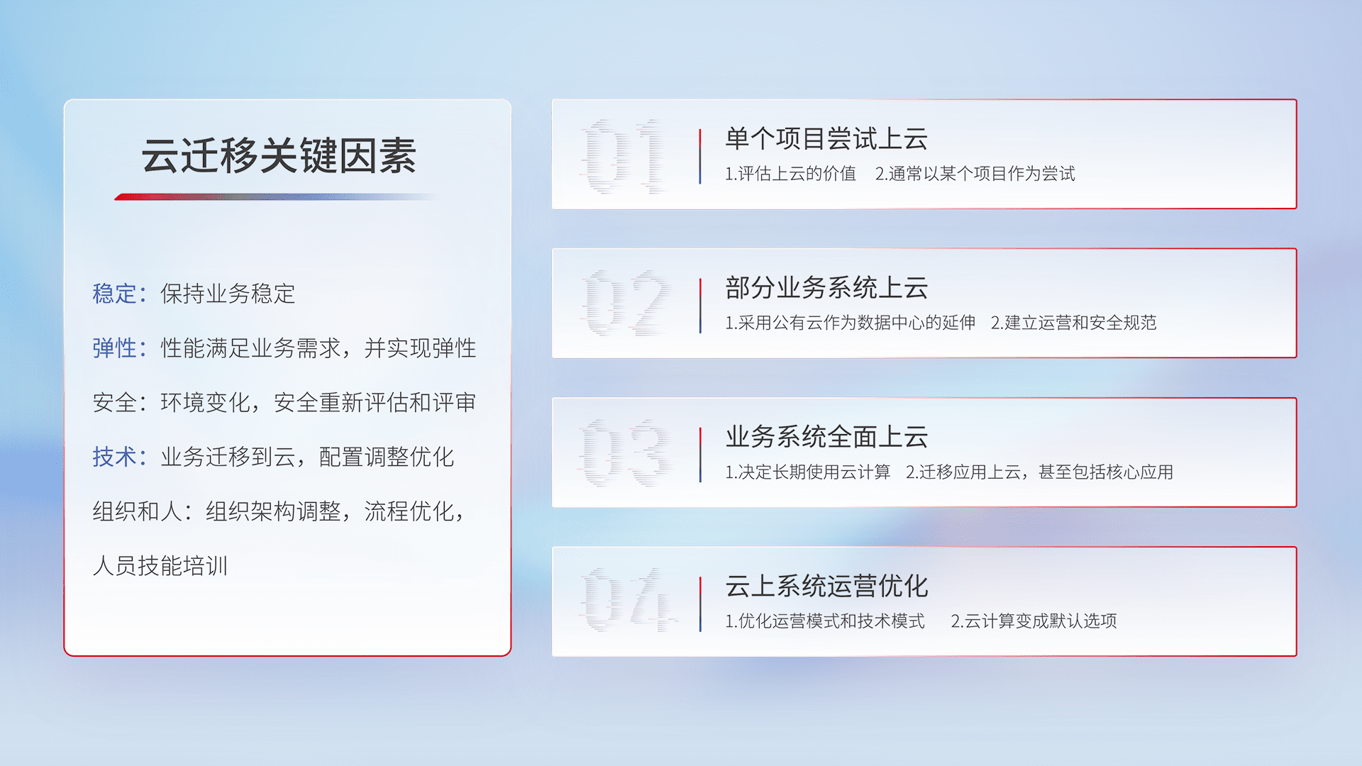 结合实际业务,,从规划设计、、、云平台选型、、、、云原生改造、、、数据迁移、、、、集成交付,,,迁移全过程为客户识别最佳上云路径,,,,做好风险识别管理,,设计网络架构、、、身份权限、、、、安全审计合规、、操作审计、、日志审计、、、监控告警策略、、多站点容灾设计等,,,对云上基础设施进行整体规划,,提升IT治理水平,,以满足弹性、、、、高可用、、、高性能的需求。。。。