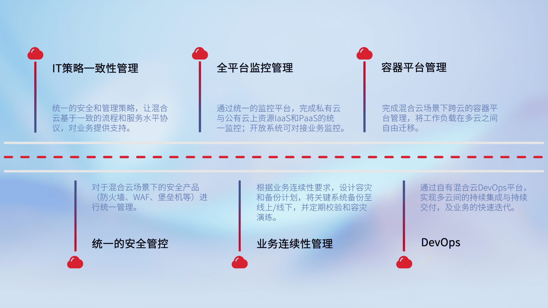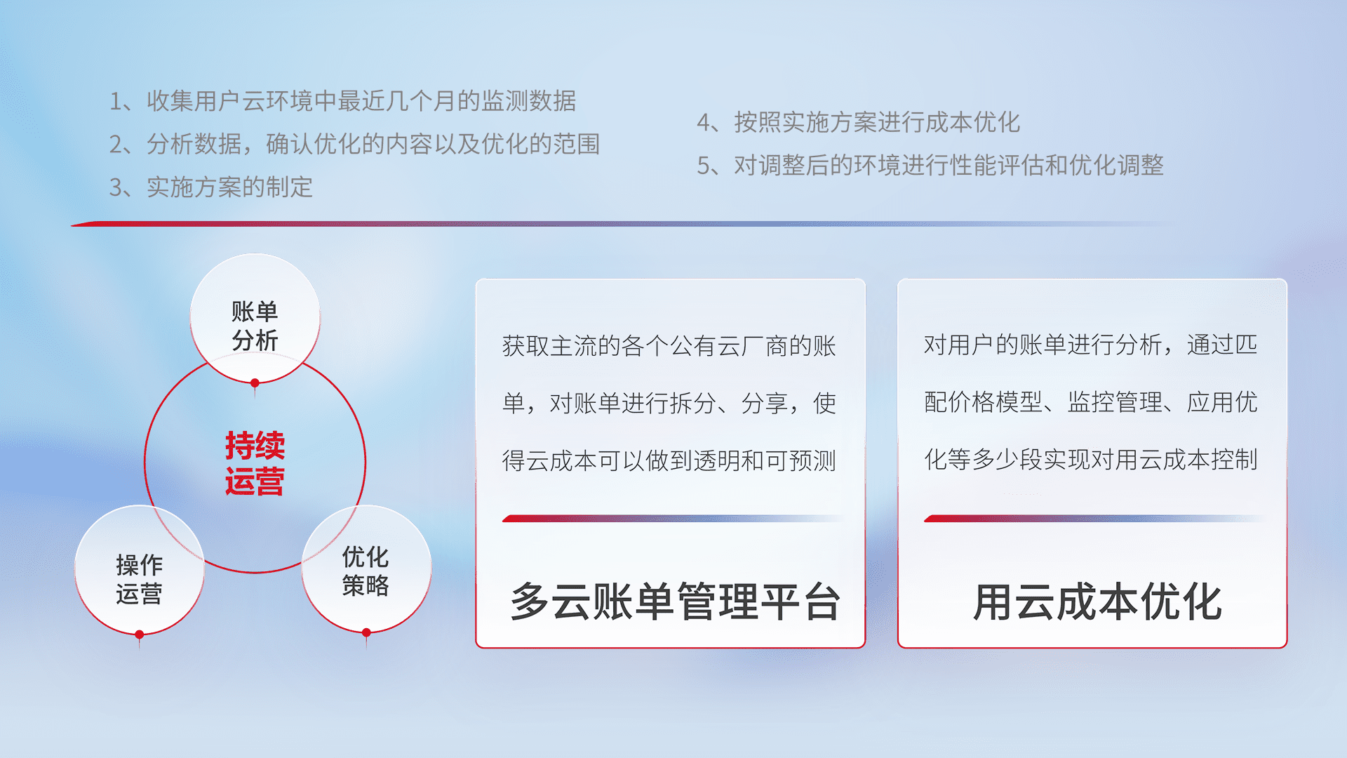 通过多云纳管,,,以统一的资源数据模型把客户的云资源进行抽象和封装,,,,进而实现对多云资源的统一操作,,保障云资源管理的可靠性、、稳定性与可用性。。。量身定制化运维内容,,,,配置、、开发运维、、、补丁管理、、、备份、、、、监控、、、认证和访问管理、、审计和日常巡检等,,保障在用云过程中的可靠度,,,稳定度以及高可用率。。。