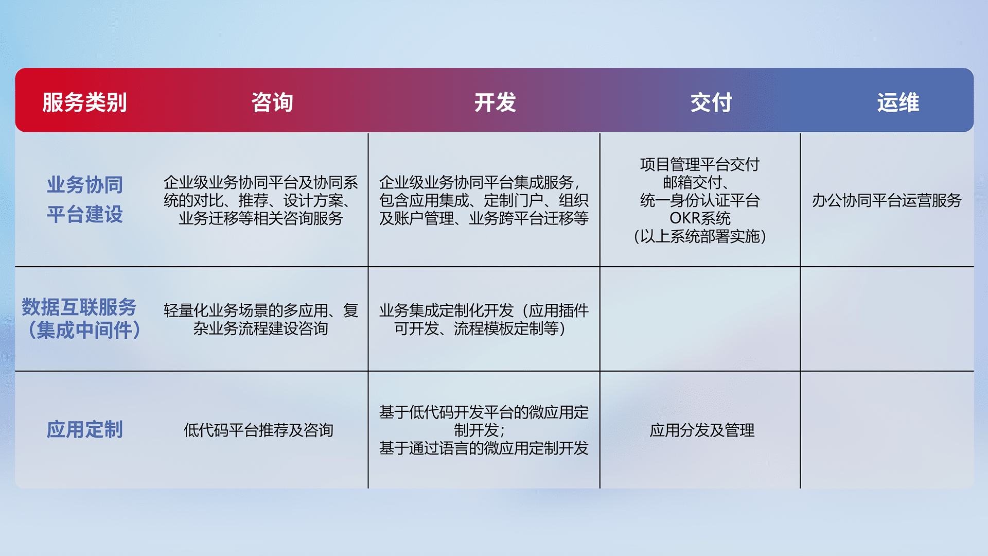针对钉钉、、、企微、、IDaas等平台级产品提供产品的规划、、、方案、、交付、、、、定制化开发等服务,,,,实现如统一协同办公、、、、智能客户服务、、、混合会议管理、、智能数据查询、、等业务场景,,实现数字化转型。。